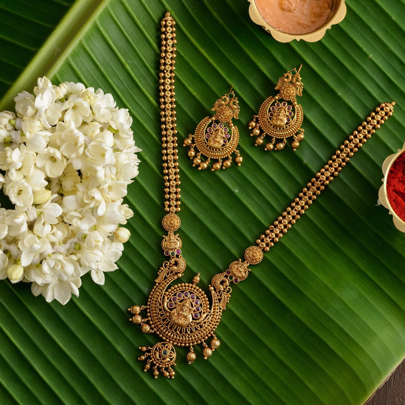 antique gold finished goddess lakshmi designed simplistic neckpiece set comes with a pair of chandbali earrings