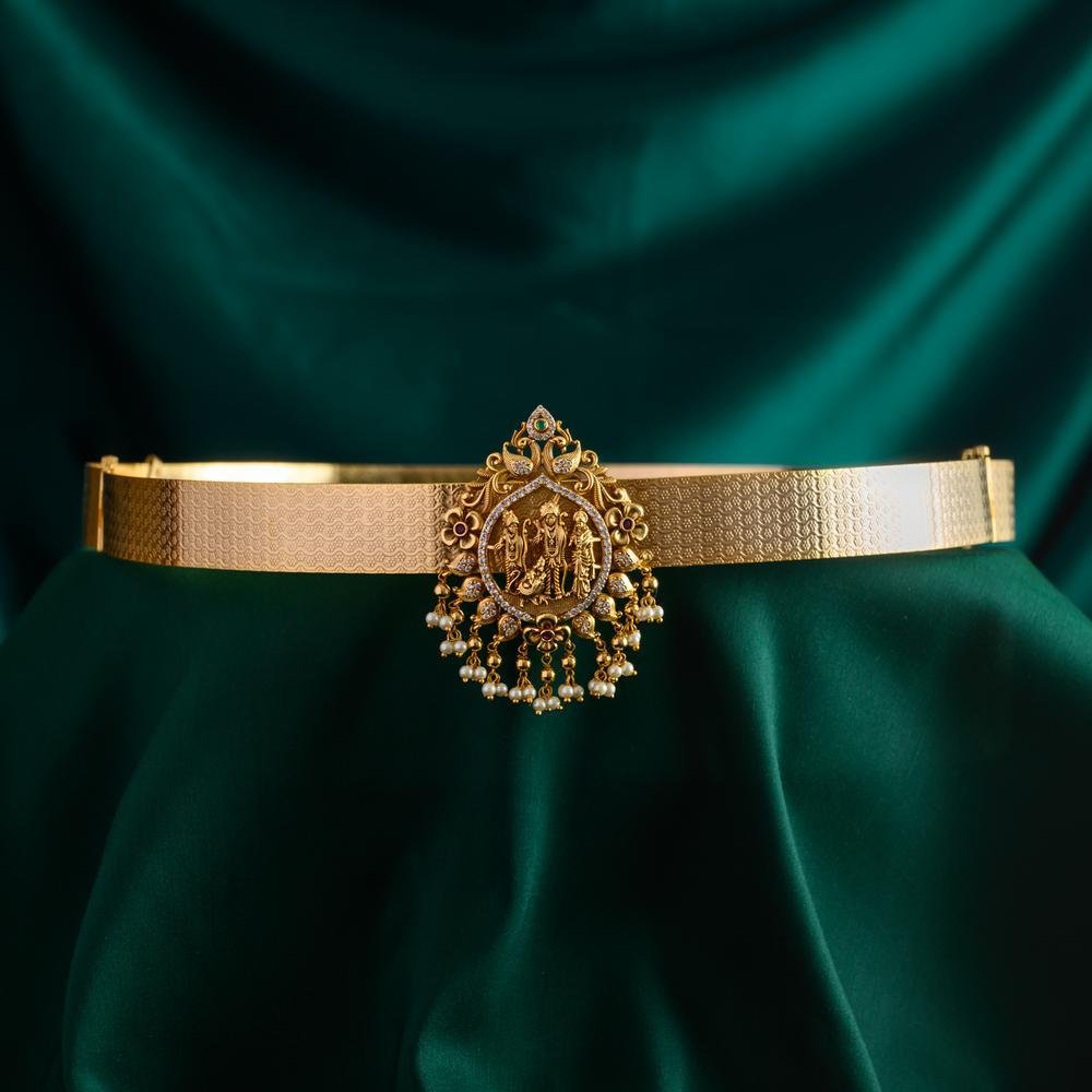 matte gold finished peacock and floral designer golden beaded and cluster pearl work temple designer bridal hipbelt size 32to40