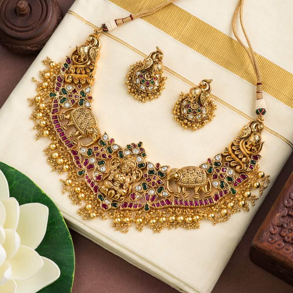 Matte gold finished heavy bridal exqusite stone worked neckpiece set