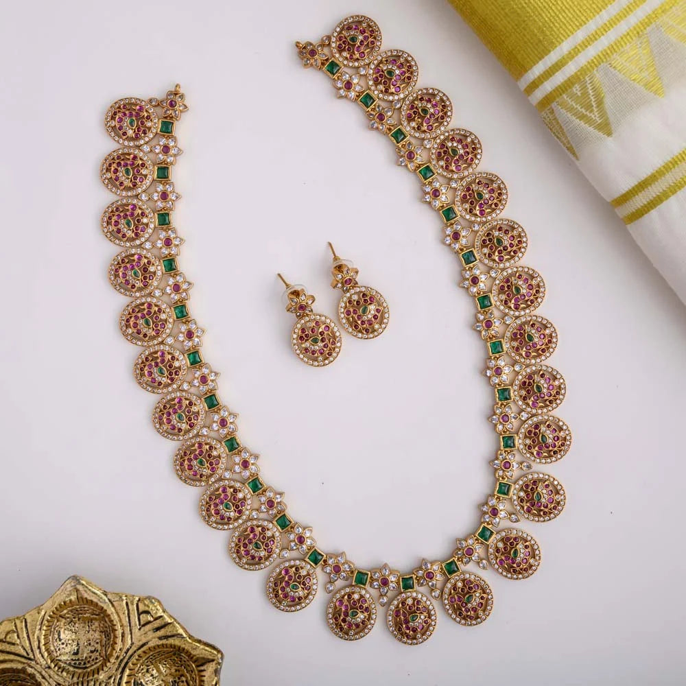 antique gold finished exquisite peacock coin designed heavy stone worked long haaram set