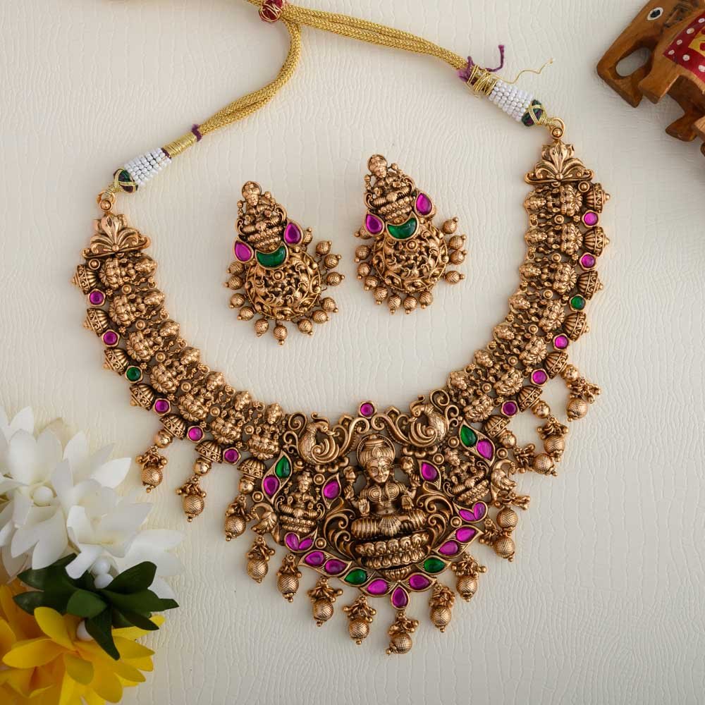 antique gold finished temple designer 3d intricate worked premium jadau stone worked Lakshmi neckpiece set
