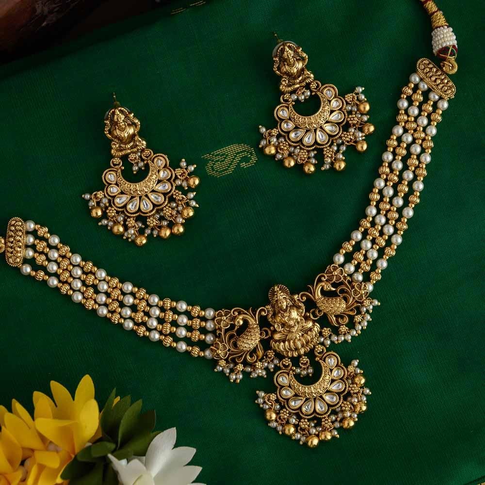 antique gold finished goddess Lakshmi and peacock designed four layered kundan stone worked statement choker set