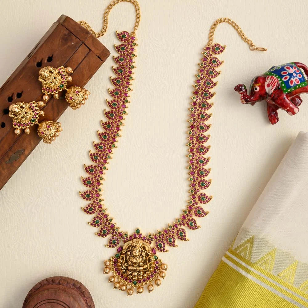 antique gold finished temple designer 3d worked goddess Lakshmi and maangaz designed haaram set comes with the bold jhumkas
