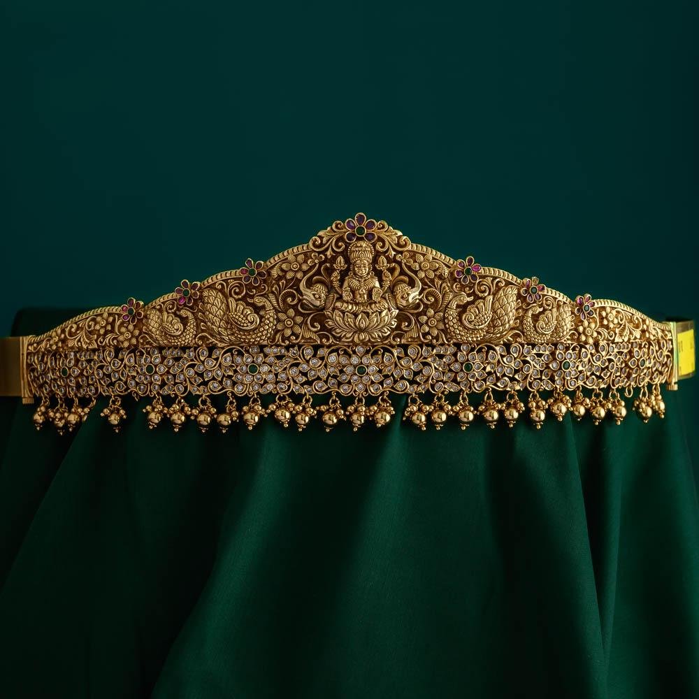 antique gold finished goddess Lakshmi ,peacock, elephant and floral worked temple designer 3d real gold inspired bridal hipbelt