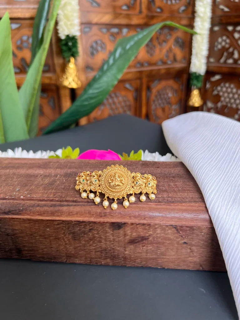 Add a touch of tradition to your hairstyle with this intricately crafted temple designer hair clip. Inspired by South Indian temple art, it’s perfect for festive looks, weddings, and ethnic styling