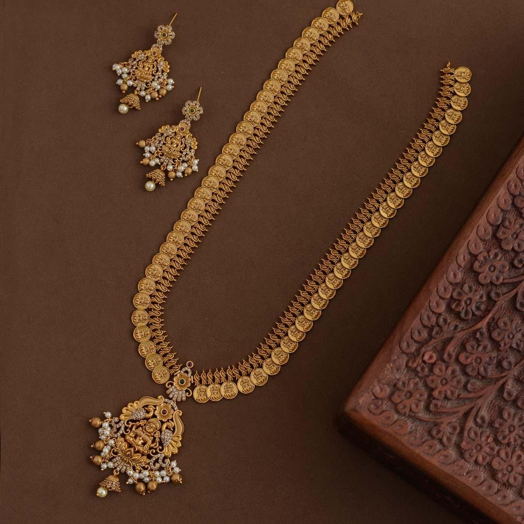 Matte gold finished goddess lakshmi coin designed haaram set, comes with a pair of light weighted earrings.