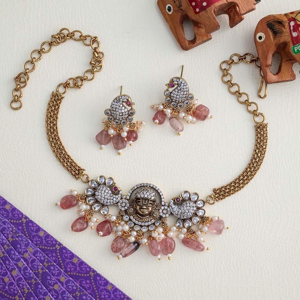 antique black gold finished tirumal namam victorian heavy stone worked peacock designed chic choker set